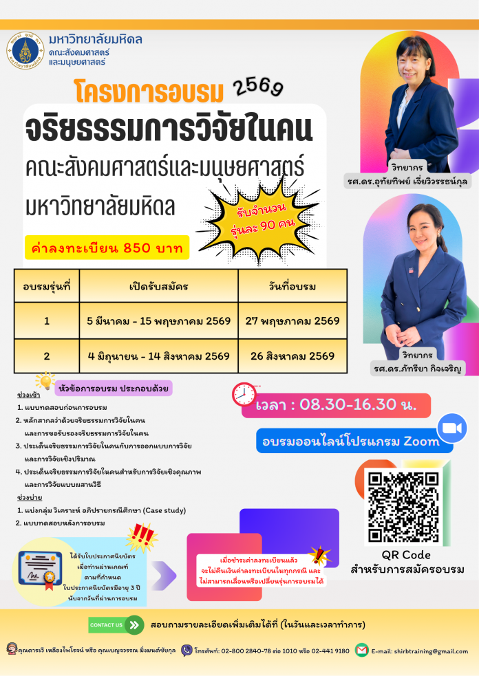 จัดอบรมจำนวน 2 รุ่น รุ่นละ 90 คน ดังนี้ 🔺 รุ่นที่ 1 ในวันพุธที่ 27 พฤษภาคม พ.ศ. 2569 เวลา 08.30-16.30 น. (เปิดรับสมัครตั้งแต่วันที่ 5 มีนาคม-15 พฤษภาคม พ.ศ. 2569) 🔺 รุ่นที่ 2 ในวันพุธที่ 26 สิงหาคม พ.ศ. 2569 เวลา 08.30-16.30 น. (เปิดรับสมัครตั้งแต่วันที่ 4 มิถุนายน-14 สิงหาคม พ.ศ. 2569) 💻 อบรมเชิงปฏิบัติการผ่านระบบออนไลน์ โปรแกรม Zoom Meetings 💵 อัตราค่าลงทะเบียนการอบรมเป็นเงินจำนวน 850 บาท (แปดร้อยห้าสิบบาทถ้วน) 🏆 ผู้เข้าร่วมอบรมได้รับใบประกาศนียบัตรรับรองจากคณะสังคมศาสตร์และมนุษยศาสตร์ มหาวิทยาลัยมหิดล เมื่อท่านผ่านเกณฑ์ตามที่กำหนด (ใบประกาศนียบัตรมีอายุ 3 ปี) 📌 Link สำหรับการสมัครอบรม:https://forms.gle/AaBQo4KJ7xY79o53A 📌 Link รายละเอียดโครงการอบรม: https://drive.google.com/drive/folders/1-wWdjMkZIqrRLUu16oul_lEyaXqrxbuu?usp=drive_link ☎️ สอบถามข้อมูลเพิ่มเติม (ในวันและเวลาทำการ) ดาระวี เหลืองไพโรจน์ และ เบญจวรรณ มิ่งมนต์ชัยกุล โทรศัพท์: 02-800 2840-78 ต่อ 1010 หรือ 02-441 9180 E-mail: shirbtraining@gmail.com